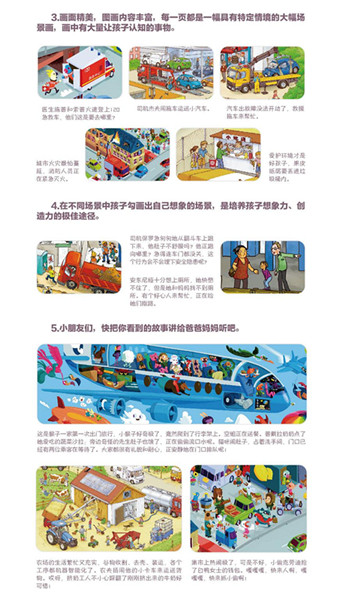 肖玥译的《我的想象力训练书(共5册)》是一套属于智力游戏—学前教育—教学参考资料的儿童图书。 五本书,五个主题。热热闹闹的工地、繁忙的机场、城堡里面飞奔着的各种小汽车、一年四季不同的施工现场、汽车俱乐部的成员……书中每一页都是一幅具有特定情境的大幅场景画,画中包含着生动有趣的故事,大家开车去看码头汽车大赛,却拥堵在高速公路上;三只小松鼠面对没油的汽车愁眉不展了;女警察丽安娜正在追铺抢劫犯克劳迪;、普芙教授发明了导弹运载汽车;佐默尔一家在房车里度过了假期;警察施普和索普紧急赶往事故现场…… 孩子通过大幅画面中丰满的细节,找到一个又一个故事线索、人物情节。根据画面,孩子可以自由发挥,在不同场景里勾画出自己想象出的故事,兴趣盎然地表达出来。是培养孩子想象力、专注力、创造力、表达力的*佳途径。