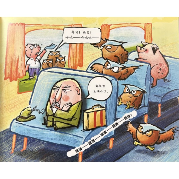 牢骚先生身穿一套绿色西服、头顶羽毛礼帽,留着精致的小胡子,提着行李箱,登上火车前往度假地。却没想到,这列车上全是奇奇怪怪的动物们不说,还一直找不到满意的座位。更令牢骚先生受不了的是:火车一路上上下下,穿越钻石矿、火山还有海洋,竟然还有个360度过山车!这下怎么办才好呢,牢骚先生会大发雷霆吗? 为了孩子们能和牢骚先生一起体验有趣刺激的火车旅行,作者运用变换方向的翻页互动设计,打造火车行进中颠簸的趣味性,让孩子可以沉浸式体验火车,亲自动手演绎牢骚先生的“倒霉”之旅,在爆笑中见证牢骚先生的改变。 绘本中藏着很多惊喜,除了不断转动方向的书页,细心的小朋友还会发现车厢里的每位乘客都性格各异,刺猬先生喜欢读报、乌龟拥有睡觉专属睡帽和小枕头、鸭子喜欢吹泡泡,还有围着围巾优雅精致的蛇小姐……大家都在享受这次难得的假期。明亮欢快的插画充满感染力,轻快幽默的故事情节,读完后,孩子们还会有点儿意犹未尽。