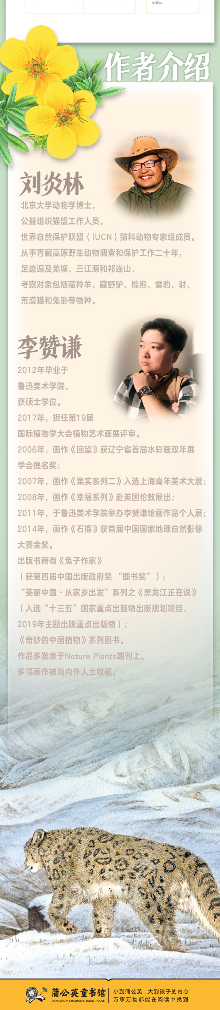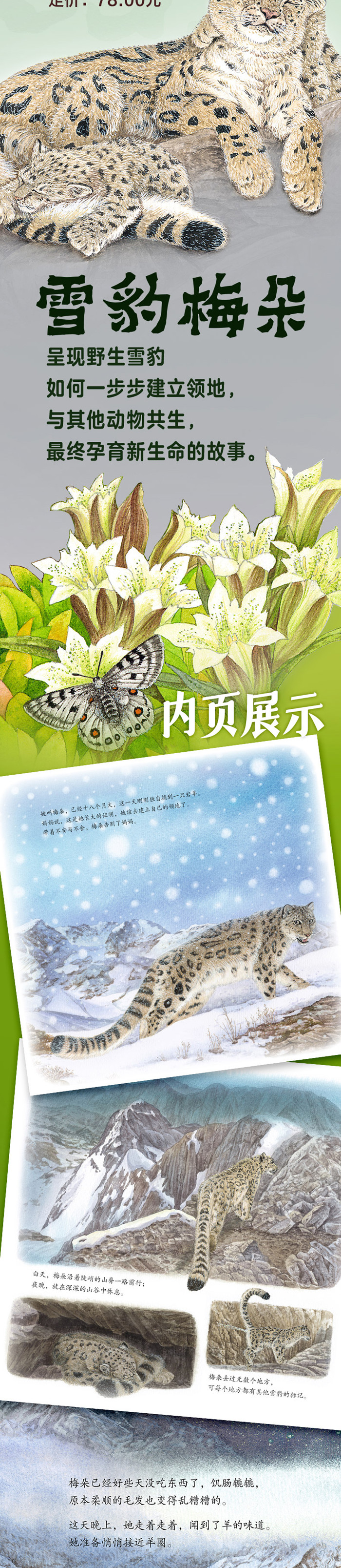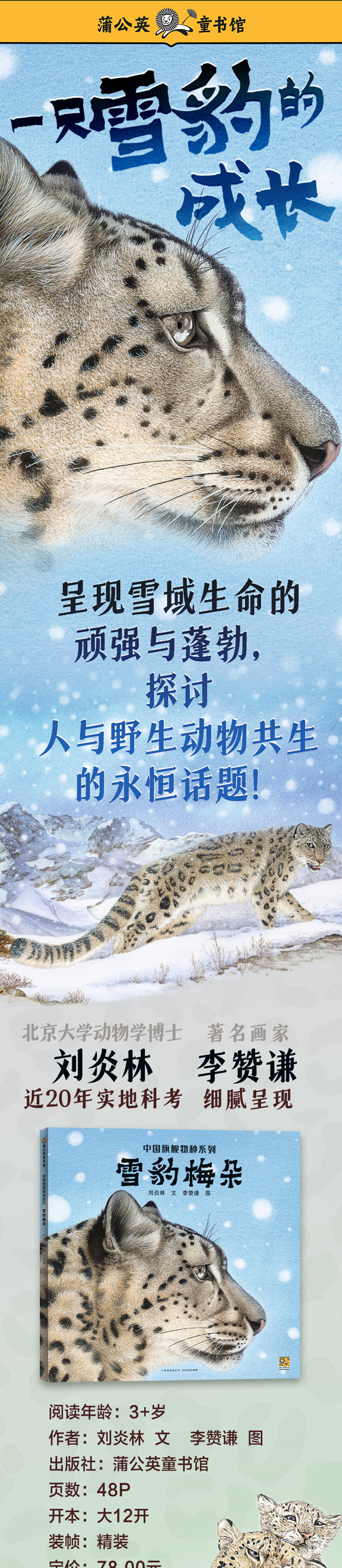 本书呈现了野生雪豹生命中重要的一段历程——独立,作者用充满诗意的语言,带我们领略雪山上神秘的生命,如何一步步建立领地,与其他动物共生,终孕育新生命,生动呈现人与野生动物共生的永恒话题。 北京大学动物学博士、野生动物保护者刘炎林近20年实地科考,著名画家李赞谦细腻呈现! 本书由中国野生动物保护协会支持,时坤、张劲硕科学审定! 本书采用故事 科普形式,详细介绍了雪豹相关科普知识,向孩子传达自然保护理念,引发孩子思考人与动物与自然的关系! 12开大开本,画面更丰富,细腻呈现雪域高原上的生命奇迹,更适合孩子仔细阅读! 随书附《动物保护倡议书》,呼吁孩子一起参与到野生动物保护的事业中!