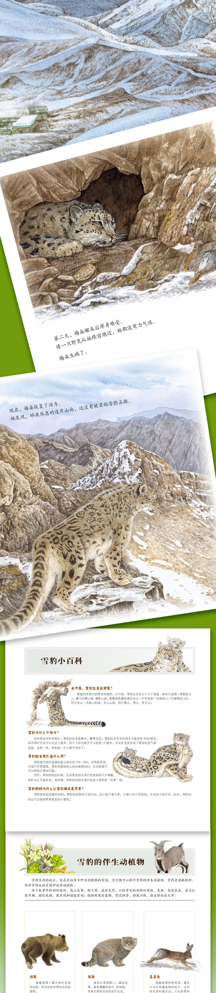 大雪纷飞的祁连山上, 雪豹梅朵刚刚独自捕到一头岩羊。 但接着,她却被妈妈赶出了家—— 梅朵该去建立自己的领地了。 从现在起,她将独自面对饥饿、严寒、疾病, 学习对这个雪域生命而言最重要的事情:独立。