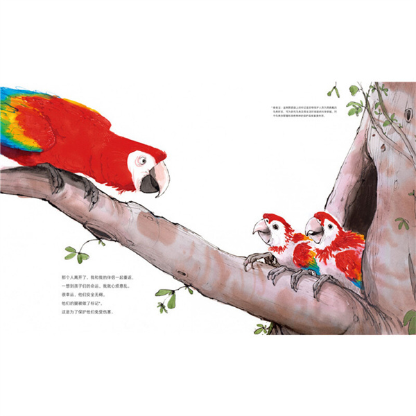 《金刚鹦鹉的回家路》:本书聚焦于亚马逊森林濒临灭绝的物种——绯红金刚鹦鹉。由于人类砍伐森林、过度捕捉,金刚鹦鹉不得不离开家乡,离开心爱的孩子。后来在护林员的帮助下,金刚鹦鹉找到了自己的家人。