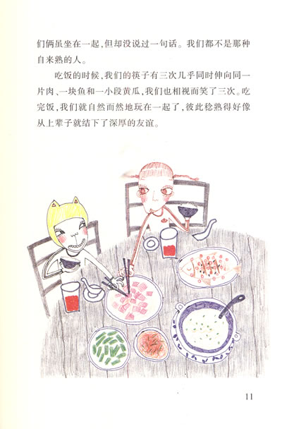 吃饭的时候,我们的筷子有三次几乎同时伸向同一片肉、一块鱼和一小段黄瓜,我们也相视而笑了三次。吃完饭,我们就自然而然地玩在一起了,彼此稔熟得好像从上辈子就结下了深厚的友谊。