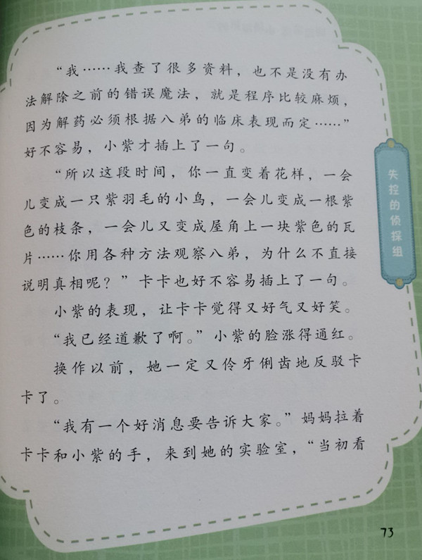 本书叙述了“卡帅侦探组”自从加入新成员小紫后,怪事接连发生,八哥羽毛一夜间突然掉光了,大帅突然“失心疯”,黑宝石出现,小女巫失踪,红宝石出现……这些到底是怎么一回事?卡卡和爸爸妈妈、女巫大王怎么破解。全书故事曲折,有一定吸引力,且配了相应的插图,符合儿童阅读心理。