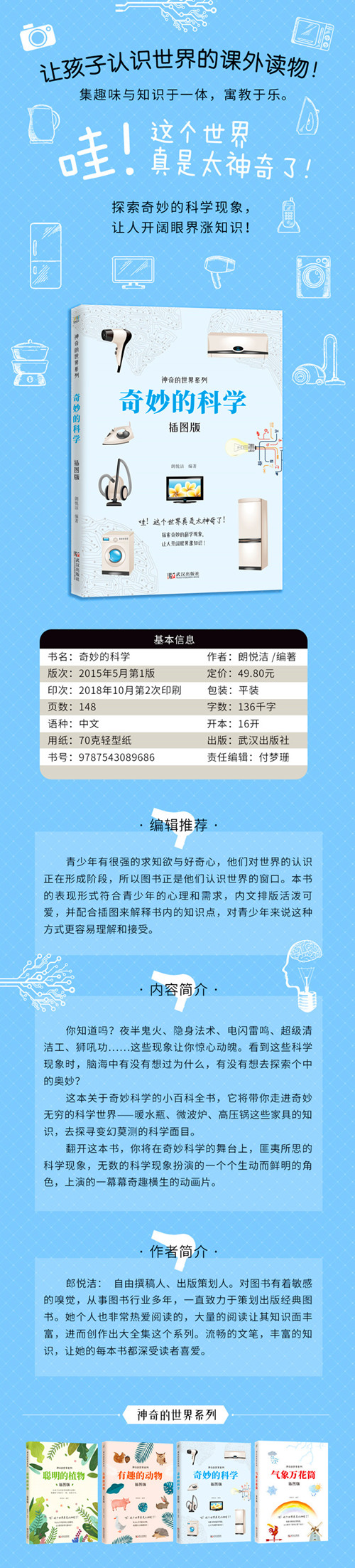 《奇妙的科学》让孩子认识世界的课外读物!集趣味与知识于一体,寓教于乐。 青少年有很强的求知欲与好奇心,他们对世界的认识正在形成阶段,所以图书正是他们认识世界的窗口。这本关于奇妙科学的小百科全书,将带你走进奇妙无穷的科学世界——暖水瓶、微波炉、高压锅这些家具的知识,去探寻变幻莫测的科学面目。本书的表现形式符合青少年的心理和需求,内文排版活泼可爱,并配合插图来解释书内的知识点,对青少年来说这种方式更容易理解和接受。