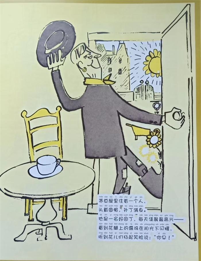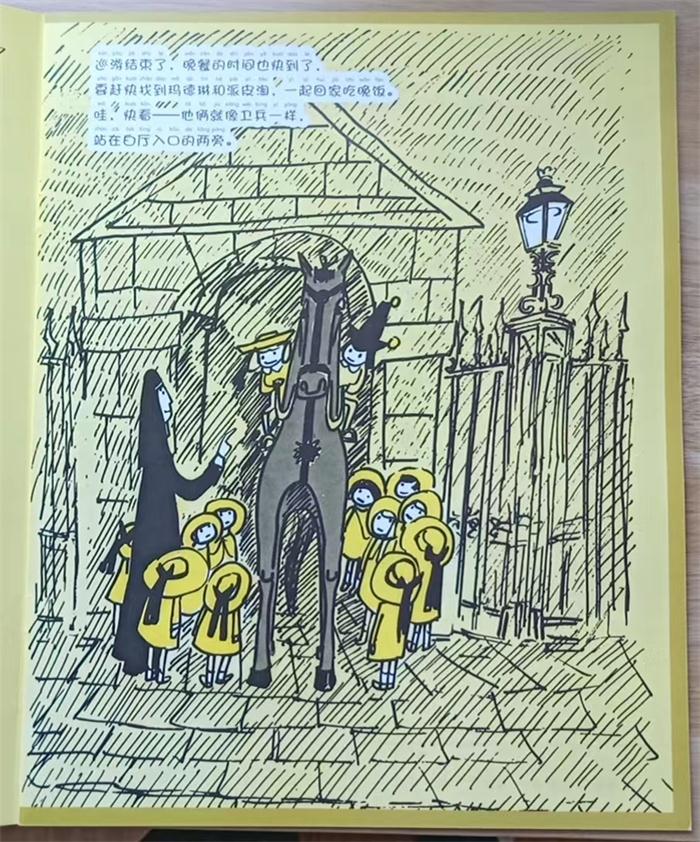 《法国女孩玛德琳》一共四十四幅图,其中八幅是彩色的,余下的三十六幅则是黄底黑白画面。彩色的除了一张是病房的花之外,其余都是巴黎的街景以及戏剧性的场面,用电影语言来说就是远景,如第9页,孩子们穿过旺多姆广场时,遇到一个捂着帽子紧追珠宝盗贼的警察。第24页救护车驶过有埃菲尔铁塔耸立的街道。而黄色背景的黑白画面,多半是房子里面发生的事,如孩子们刷牙、睡觉。