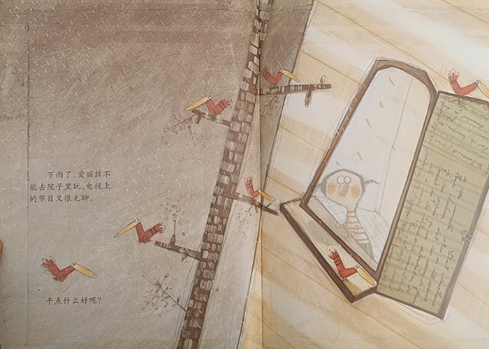 《童话里的爱丽丝》是意大利著名儿童文学家罗大里以爱丽丝为主角的一系列儿童故事中的一则。故事里的爱丽丝总是糊里糊涂地撞进各种稀奇古怪的场所。那是在一个无聊的下雨天,爱丽丝没法儿去外面玩,只好从书架上抽出童话书来看。就这样,她先后掉进了《睡美人》、《小红帽》和《穿靴子的猫》的童话世界里,搅乱了那里面的故事逻辑,最后,穿靴子的猫把她给赶了出来。回到现实中的爱丽丝刚好等到雨停,“她可以去院子里玩了”,一切看上去和原来没什么两样。罗大里的这个童话故事,让人不禁揣测他似乎是在向卡洛尔这位儿童游戏文学的英国先驱致意呢!
