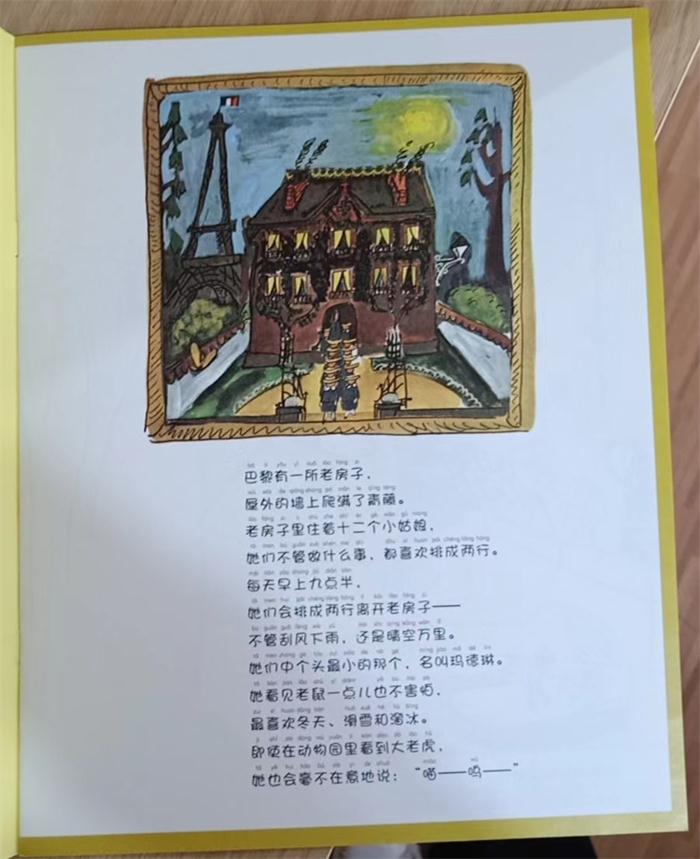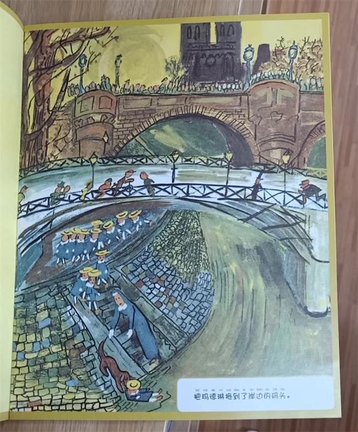 《法国女孩玛德琳》一共四十四幅图,其中八幅是彩色的,余下的三十六幅则是黄底黑白画面。彩色的除了一张是病房的花之外,其余都是巴黎的街景以及戏剧性的场面,用电影语言来说就是远景,如第9页,孩子们穿过旺多姆广场时,遇到一个捂着帽子紧追珠宝盗贼的警察。第24页救护车驶过有埃菲尔铁塔耸立的街道。而黄色背景的黑白画面,多半是房子里面发生的事,如孩子们刷牙、睡觉。
