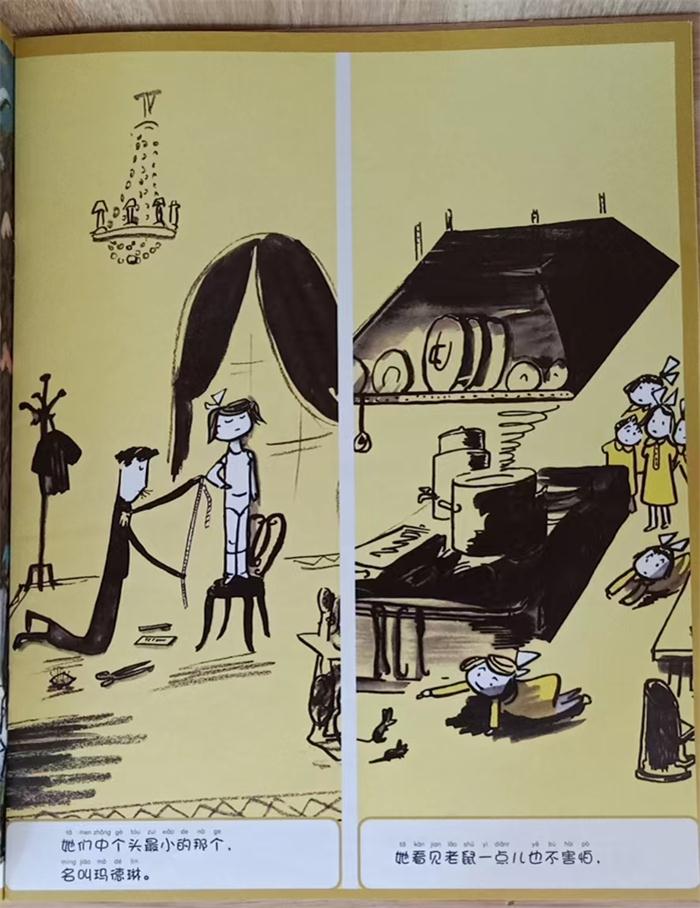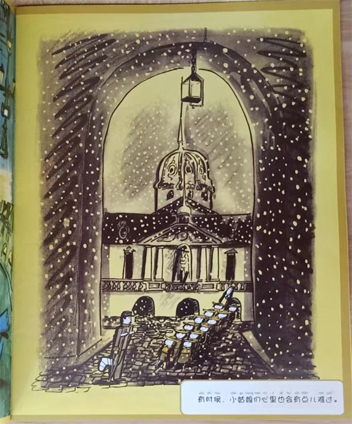 《法国女孩玛德琳》一共四十四幅图,其中八幅是彩色的,余下的三十六幅则是黄底黑白画面。彩色的除了一张是病房的花之外,其余都是巴黎的街景以及戏剧性的场面,用电影语言来说就是远景,如第9页,孩子们穿过旺多姆广场时,遇到一个捂着帽子紧追珠宝盗贼的警察。第24页救护车驶过有埃菲尔铁塔耸立的街道。而黄色背景的黑白画面,多半是房子里面发生的事,如孩子们刷牙、睡觉。