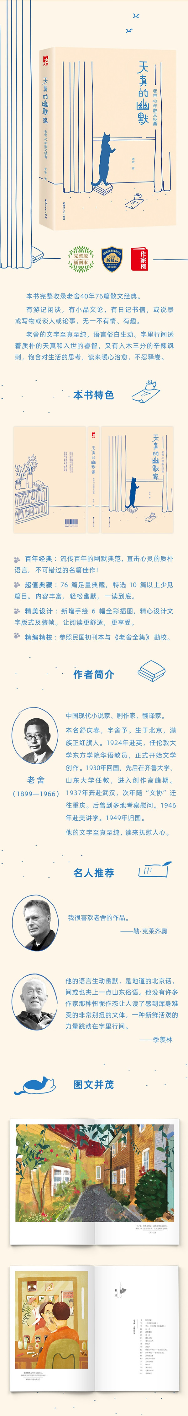 本书完整收录老舍40年76篇散文经典,特选10篇以上少见篇目。 有游记闲谈,有小品文论,有日记书信,或说景或写物或谈人或论事,无一不有情、有趣。 老舍是公认的幽默大师、语言大师。他的文字至真至纯,语言俗白生动。字里行间透着质朴的天真和入世的睿智,又有入木三分的辛辣讽刺,饱含对生活的思考,读来暖心治愈,不忍释卷。