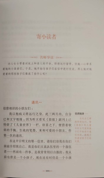 世界上有很多小孩,天天盼着自己长大--长成大人。然而有一个很著名的大人却想做回小孩。她说:”有一件事,是我常常用以自傲的:就是我从前曾是一个小孩子,现在还有时仍是一个小孩子。”这个大人就是冰心。冰心是我国著名的女作家、诗人,她很喜欢孩子,为孩子们写了许多散文、诗歌和小说。上面那句话,就是她在《寄小读者》中,对孩子们说的。在她的文章中,时常出现花朵、小草、清流、流星这些小巧轻灵的名字,冰心看到这些平凡的自然之物,就像一般人看到的一样,但是她又看到了一般人看不到的东西。