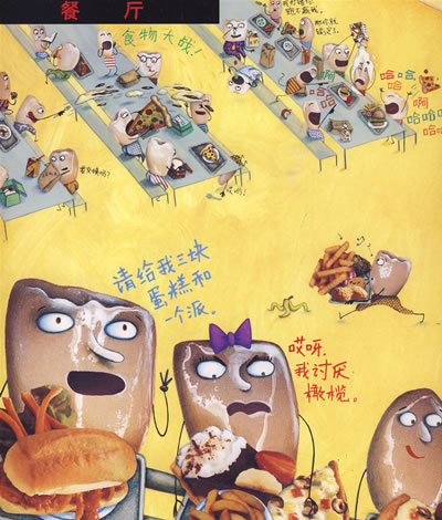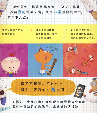 牙齿学校校歌:我们是牙齿,我们咬咬咬。现在就放下手边的事情,你要让我们干干净净。为我们勤刷洗,刷刷、清清、又剔剔,牙线清理,我们就跟你永远在一起。你和我共同努力,一起让笑容更美丽。
