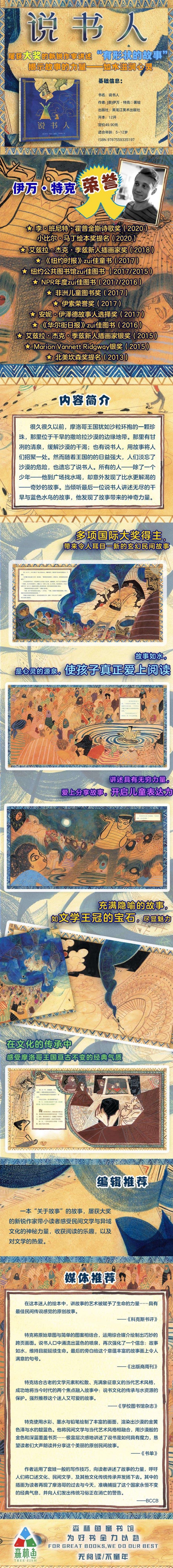 获得2015艾兹拉·杰克·季兹插画新人获后,伊万·特克作为作者,创作了他的处女作插画:古老的民间故事,讲述故事和讲故事的力量。很久很久以前,就像一粒珍珠围绕着一粒沙子,摩洛哥王国形成于伟大而干燥的撒哈拉沙漠的边缘,有凉爽、清新的水解缓解沙漠的饥渴,说书人把人们聚集在一起。