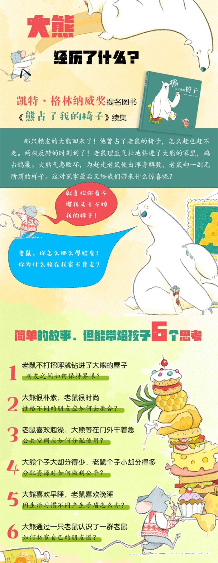 那只赖皮的大熊回来了!他曾占了老鼠的椅子,怎么赶也赶不走。两极反转的时刻到了!老鼠理直气壮地钻进了大熊的家里,“鸠占鹊巢”。大熊气急败坏,为赶走老鼠使出浑身解数,老鼠却一副“就喜欢你看不惯我又干不掉我的样子”。这对冤家后又给我们带来什么惊喜呢?