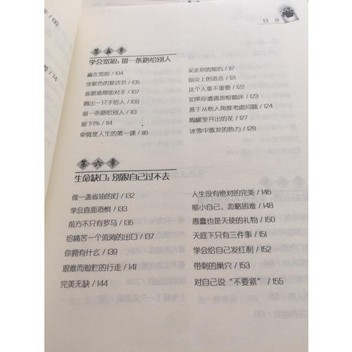 “心灵鸡汤”系列图书是世界公认的畅销经典,它已经推出数百个版本,在全球的销售量已超过1亿册,影响厂数以千万汁的人。作为“心灵鸡汤系列图书之经典畅销珍藏本。本书将让你体验前所未有的心灵盛宴,获得终身受用的人生智慧。书中收录的经典哲理美文,其内容涉及人生的方方面面,它们有的睿智凝练,让心灵为之震撼;有的灵气十足,宛如一线罅隙中奔涌而出的清泉,悄然渗入心田……每篇故事都在向人们阱述一份美好的情感、一种人生的意义。每一个故事,似涓涓细流,在你无暇的心田缓缓流淌,渗透在生命的每一个脚步中,使你获得心灵的洗礼,在品味中得到智慧与快乐的启迪和感晤。