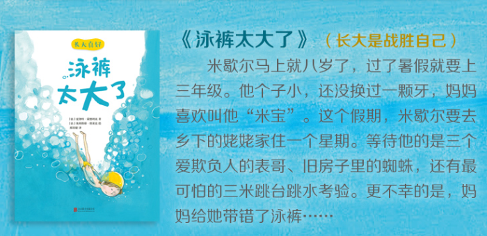 《泳裤太大了》:米歇尔马上就八岁了,过了暑假就要上三年级。他在班上个子小,到现在还没换过一颗牙,妈妈喜欢叫他“米宝”。这个假期,米歇尔要去乡下的姥姥家住一个星期。等待他的是三个爱欺负人的表哥、旧房子里的蜘蛛,还有可怕的三米跳台跳水考验。更不幸的是,妈妈给她带错了泳裤……