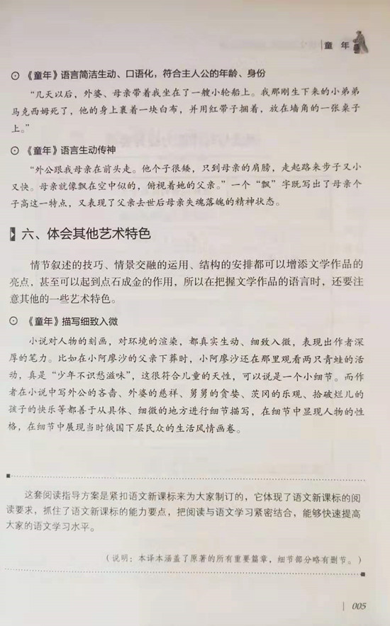 《童年》是高尔基对于自己童年生活的回忆录。本书以一个孩子的视角,描绘了19世纪末期俄国底层劳动人民的苦难生活以及具有局限性的思想。在书中,既有外祖母的慈爱呵护、也有外祖父的自私冷酷;既有孩子们之间的纯真友谊,也有着成年人的市侩与狭隘。作者不仅致力于挖掘当时底层民众的“劣根性”,同时也穿插了对于亲情、友情等一系列真挚感情地描绘。全书虽然以淡淡的哀愁作为基调,但是在哀愁当中又不乏对于苦难的勇敢抗争。正是上述一系列复杂感情的完美交融,使得读者在阅读的同时,不仅会为小主人公的命运揪心,更会从小主人公面对苦难而不自我放弃的行为中汲取巨大的力量,同时还能让读者在灵魂深处产生震撼,进而引导读者自发思考导致小主人公苦难的深层原因,从而更加热爱今天的幸福生活。