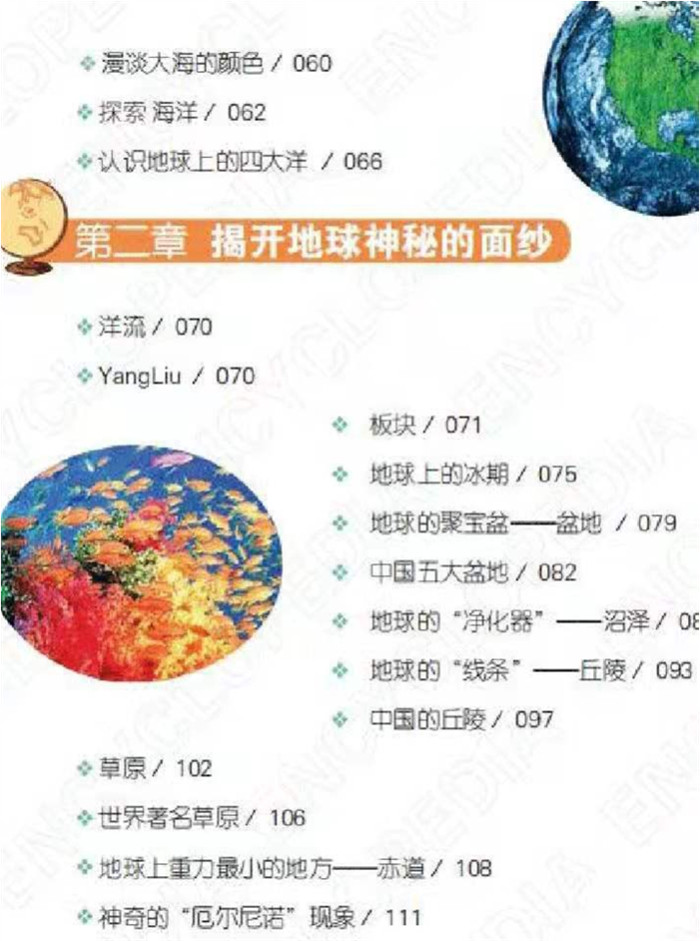 《地球奥秘》让你大开眼界!用最少的时间了解最多的知识,把学生塑造成一个知识丰富、头脑灵活、能力超群的“万事通地球隐藏着无数的未知和奥秘:神秘莫测的宇宙、神奇的大自然、千变万化的气候等等所有的一切都让人们有着无限的神奇和感动。本书将所有的精彩囊括其中:有大自然的奇异景致,生物界的多姿多彩,人类社会的奇闻逸事…每一个知识都会带给你超乎想象的神奇感受,每一次翻阅都会让你领略大自然创造的伟大奇迹。
