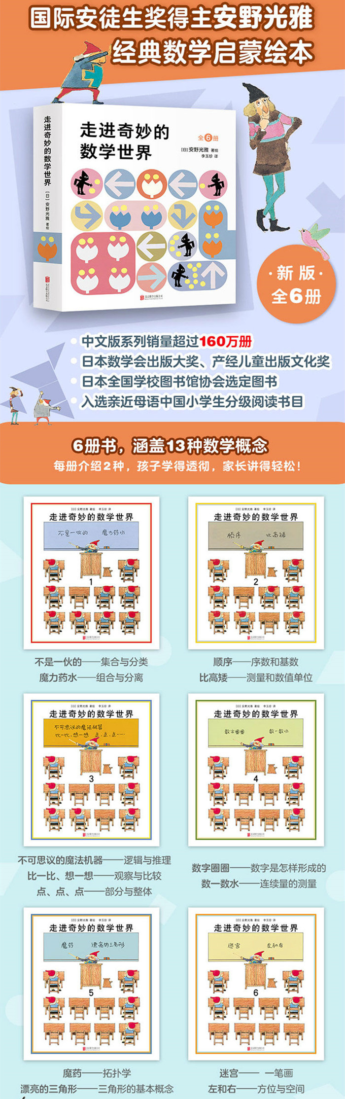 国际安徒生奖得主安野光雅经典数学启蒙绘本; 6册书,13种基本数学概念,涵盖集合与分类、序数与基数、一一对应,测量与数值单位等知识,从具象到抽象,带孩子一步步走进数学,理解数学。获日本数学会出版大奖、日本全国学校图书馆协会选定图书、日本产经儿童出版文化奖,中文版系列销量超过160万册,入选亲近母语中国小学生分级阅读书目。数学启蒙教育专家大陆博士,大J小D、六妈罗罗、小土大橙子、绘本妈妈海桐等博主力荐。
