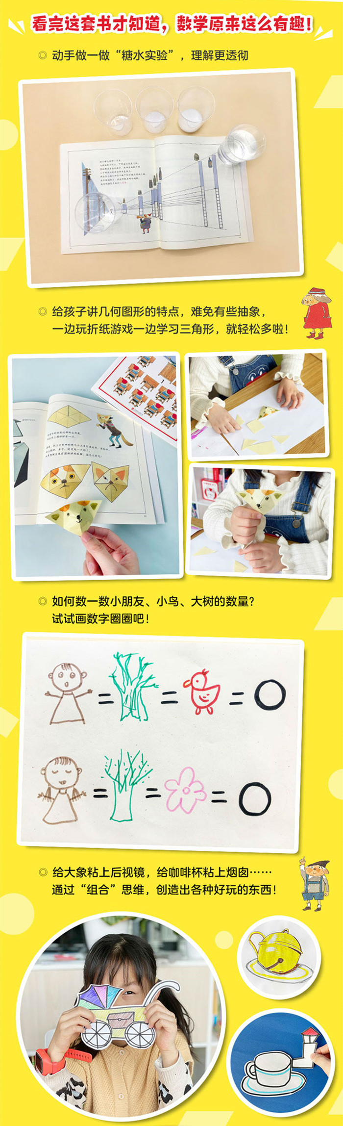 “数学”不是从1数到100,不是加减运算,它是一种思维方式,看事物的角度,是可以用在各种学科和问题上的。 这套书不教孩子数数、背公式,也不用求“标准答案”,而是由两个小矮人带着孩子折纸、画画、走迷宫……通过有趣的游戏和故事,引导孩子探索数学原理和概念的由来,潜移默化中把比较与分类、观察与实验、抽象与概括等思维能力教给孩子,让孩子真正理解数学。 《走进奇妙的数学世界3》 第一章:不可思议的魔法机器(背后的数学概念:逻辑与推理) 两个小矮人发明了一台魔法机器,把眼镜、水壶、钱包从左边的入口放进去,当它们从右边的出口出来时,都长出了眼睛和鼻子。接着换到另一种功能,把5粒豆子从入口放进去,出来时变成了10粒,小矮人们这次准备放进去4杯橘子汁,出来时会变成什么样呢?你能发现其中的规律,揭开魔法机器的秘密吗? 第二章:比一比、想一想(背后的数学概念:观察与比较) 两个洋娃娃、两只狗、两幅图、两个迷宫……左右两页的图看起来一样,但仔细看又不太一样,到底哪里一样,哪里不一样呢?对比思考是小学数学的基础,在很多时候,找到两件事物的共同点是解决问题的关键。通过仔细观察和比较,相信你很快就能得出答案。 第三章:点、点、点……(背后的数学概念:部分与整体) 邮票的边缘,有很多小圆孔,连成了一条线,这样就可以轻松地撕开邮票。拿放大镜看一幅画,会发现它也是由许多个小圆点构成的……这里的“点”不只是数学概念中的点,具有更广泛的含义,比如构成人体的细胞,构成宇宙所有物质的基本单位,还有玉米粒、蝴蝶翅膀上的鳞粉,都可以把它们看作是“点”。我们周围还有哪些东西是由许多个“点”构成的呢?认真想一想,一定会有很多新鲜的发现!
