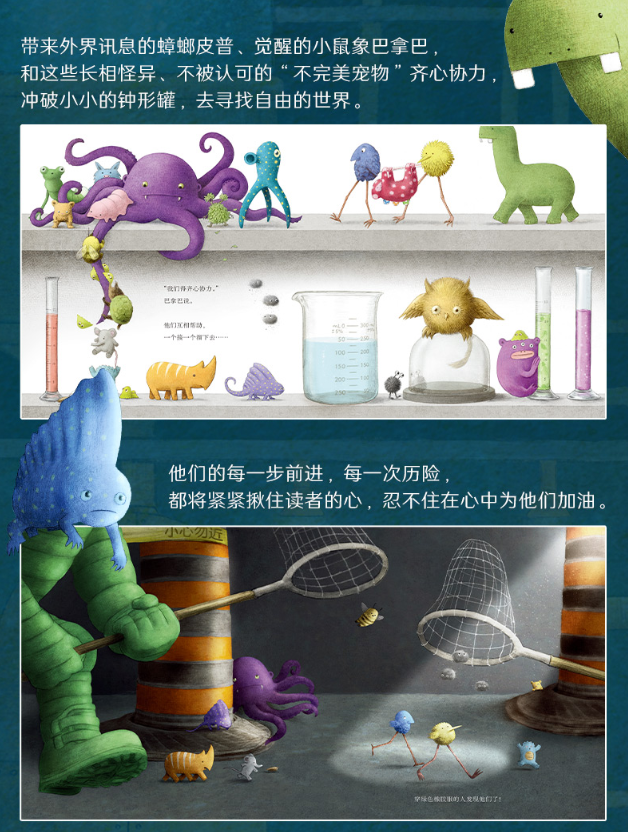 这是一本非常暖心,且充满了丰富的细节和趣味的绘本。 在完美宠物店里,孩子们可以买到转基因完美生物。小鼠象巴拿巴和他的朋友们则住宠物店在地下实验室里,因为他们都是失败的项目。巴拿巴从来没离开过小小的玻璃罩,但他梦想有一天能看到地面上的世界。在这些失败项目即将被回收处理前,巴拿巴决定带着朋友们一起逃跑。于是,他们踏上了艰难的通往自由的道路…… 相信小读者们通过阅读这本绘本,在体会阅读的乐趣之外,还能了解到:每个人都独一无二!每个小孩都是独特的“不完美小孩”,不必讨好,不必伪装,自由自在做自己就是棒的。