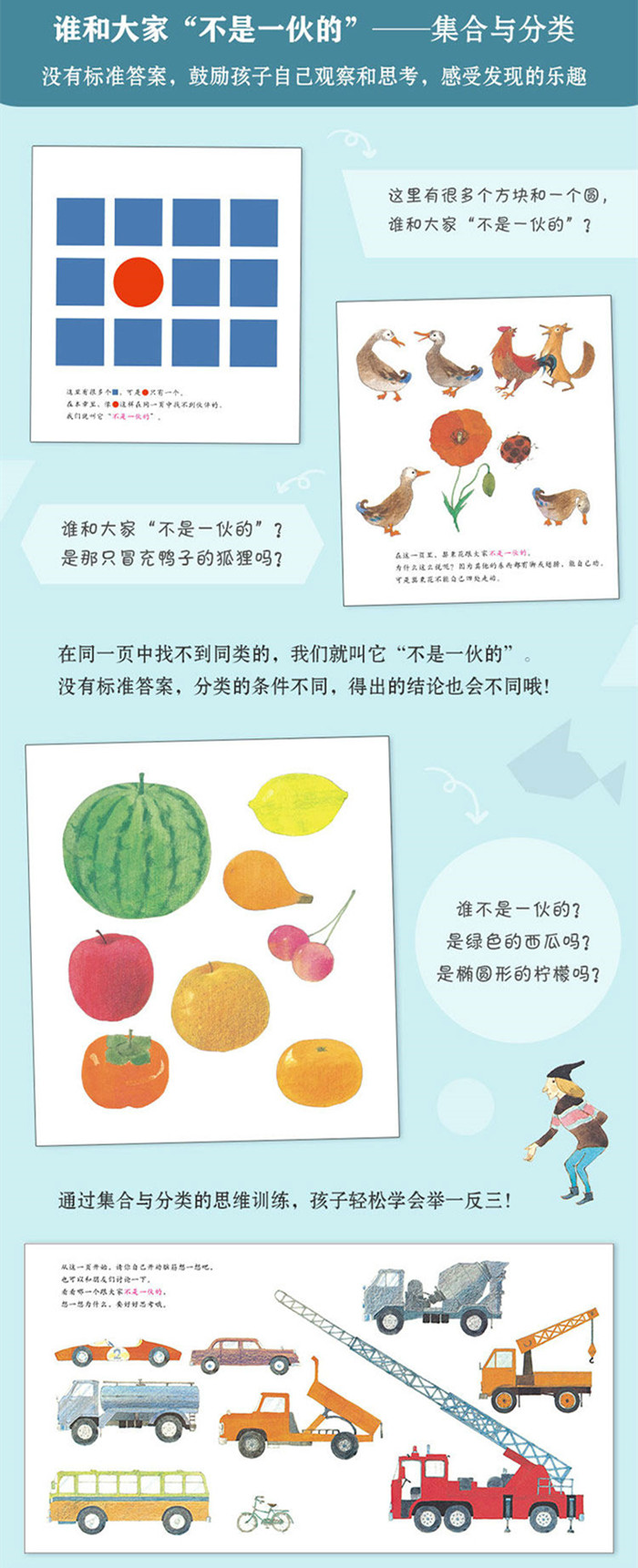 “数学”不是从1数到100,不是加减运算,它是一种思维方式,看事物的角度,是可以用在各种学科和问题上的。 这套书不教孩子数数、背公式,也不用求“标准答案”,而是由两个小矮人带着孩子折纸、画画、走迷宫……通过有趣的游戏和故事,引导孩子探索数学原理和概念的由来,潜移默化中把比较与分类、观察与实验、抽象与概括等思维能力教给孩子,让孩子真正理解数学。 《走进奇妙的数学世界1》: 第一 章:不是一伙的(背后的数学概念:集合与分类) 这里有很多个方块和一个圆,谁和大家“不是一伙的”?在同一页中找不到同类的,我们就叫它“不是一伙的”。分类的条件不同,得出的结论也会不同。西瓜、柠檬、樱桃、苹果、橘子……开动脑筋想一想,哪种水果和其他“不是一伙的”?也许答案不止一个。 第二章:魔力药水(背后的数学概念:组合) 从天使、独角兽等幻想中的事物,到带橡皮的铅笔、带轮子的椅子等现实中的事物,“组合”的概念广泛运用于生活中。两个小矮人发明了一种魔力药水,能把任意两样东西粘在一起。跟着小矮人一起,给各种东西粘上轮子、把手吧,会发明出一些什么东西呢?对了,你还可以做一些更大胆的尝试,比如给大象粘上后视镜,给咖啡杯粘上烟囱,一定会有神奇的发现!