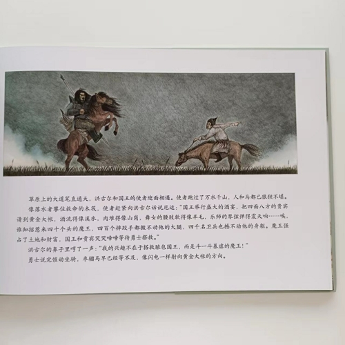 《洪古尔》是一个来自蒙古族的民间童话,四十个头的魔王侵袭平静的草原,勇士洪古尔在和魔王斗争的过程中由于骄傲被奸计所害,还好枣骝马机智勇敢地救出了他。洪古尔与枣骝马并肩作战,经过几番精彩的变化,终于打败了魔王,还给草原一片宁静与安详。