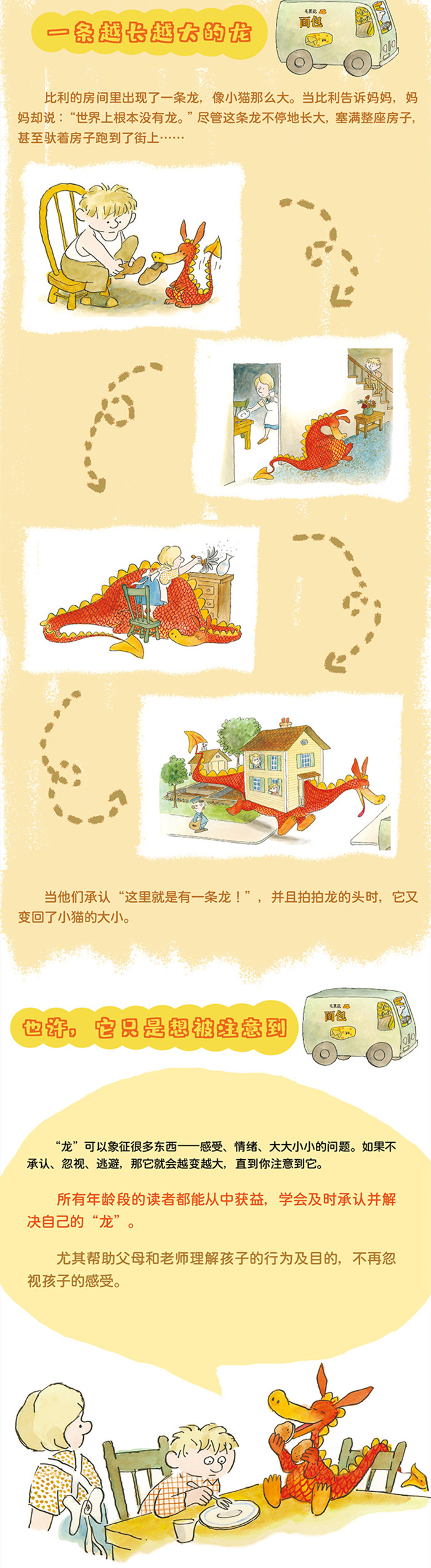 一天早晨,比利·比克斯比一醒来就发现他的房间里有一条龙,像小猫那么大。可当他告诉妈妈时,妈妈却说“世界上根本没有龙!”,即使这条龙不断长大,大到把房子都撑满了,甚至驮着房子跑到了街上!可妈妈依然说,世界上根本没有龙…… 杰克·肯特用幽默逗趣的文字和生动的卡通插画讲述了一个富有深意的故事,让人忍俊不禁,同时又发人深思。 适读年龄:3-7岁