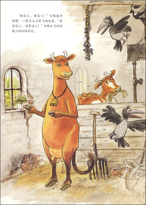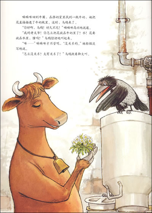 这个童话的主人公是一头有点不同寻常的小牛,她看到了牛圈外的世界,而且勇敢地走出去了。尽管她的好朋友乌鸦总是不断地提醒她:她只是一头牛,可她就是不相信人类小朋友能做的事情她却不可以做,难道就因为她是一头牛吗?乌鸦就像个墨守成规的成年人,而小牛却是个充满梦想的孩子。有趣的是,在小牛的影响下,乌鸦不知不觉地做了小牛的好帮手!