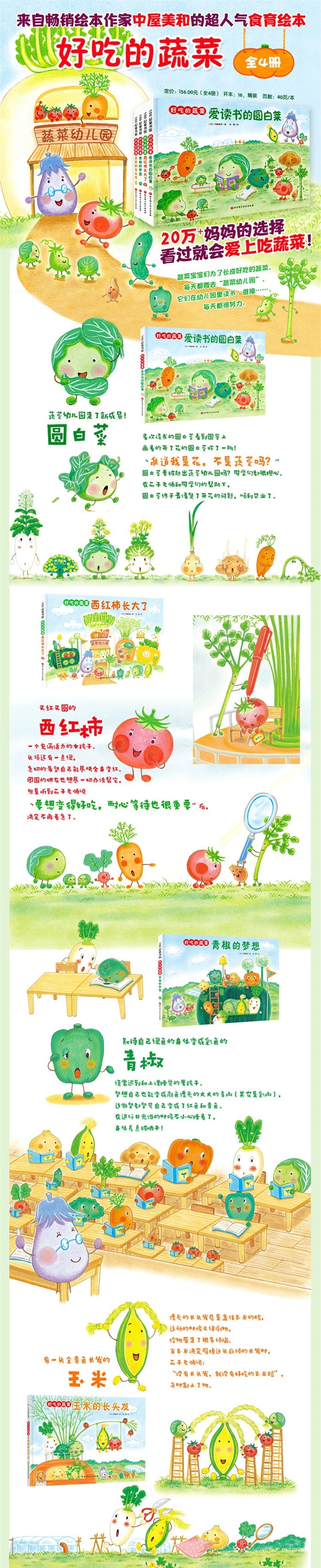 《好吃的蔬菜:爱读书的圆白菜》:圆白菜是蔬菜幼儿园里的优等生,为了变成沉沉的、脑子里装满知识的美味圆白菜,它每天都在努力学习,可是,忽然有一天,西红柿慌慌张张地跑来告诉圆白菜,它可能会开花!在茄子老师的耐心解说下,蔬菜宝宝们了解到了放置过久的蔬菜会变成的样子,也了解到只要认真学习、积极运动,就可以成为好吃的蔬菜。