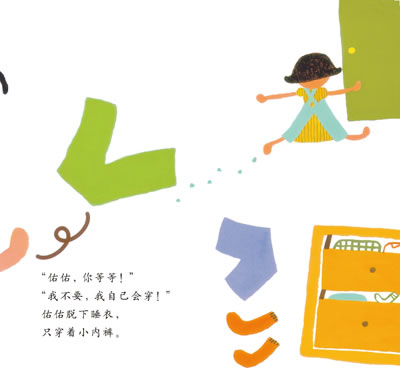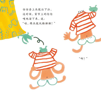 《衣服躲猫猫》妈妈要带佑佑去找小爱玩,佑佑想要自己穿衣服。娃娃伦伦从窗帘上溜了下來,跟佑佑玩起衣服躲猫猫的游戏!佑佑把衣服套在头上,先穿左手、再穿右手。还有裤子望远镜、袜子帽……