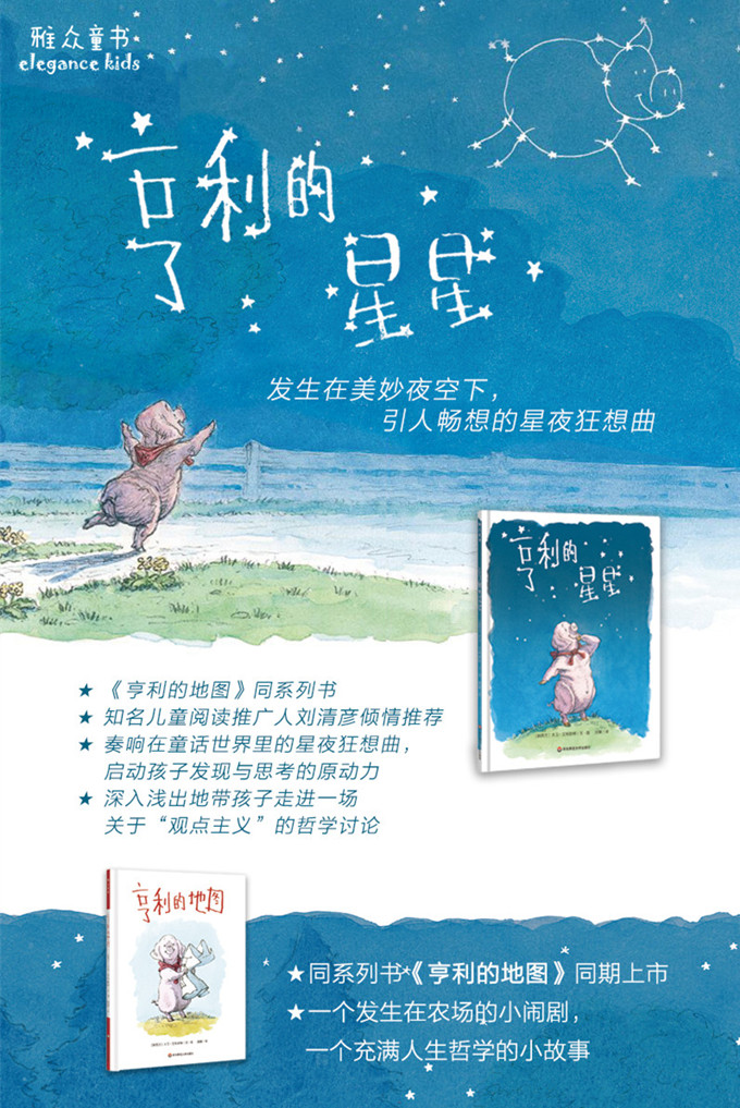 ★故事一开始,亨利在夜空中看到了一只星星连成的大猪。在接下来的故事中,因为小伙伴们彼此之间观点的冲突,亨利对自己的观点产生了怀疑和动摇。故事的*终,当星空下的一切喧闹归于平静,亨利独自站在夜空下回望满天星辰,重新审视自己的观点时,他*终找到了自我观点的价值。正如刘清彦老师所说,这个看似简单的当代童话故事,以一种深入浅出地形式探讨了 “唯心主义”观点以及尼采的“观点主义”。在缺乏“唯心主义”认识和教育的当下,这实在是一本难得多见,值得所有人反复阅读、思考的儿童绘本