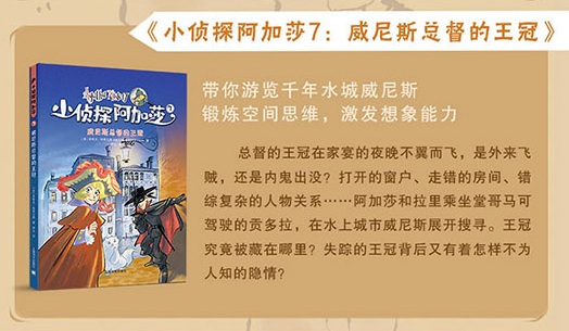 “小侦探阿加莎”系列是意大利知名儿童文学作家史蒂夫•史蒂文森的代表作,*辑包括《法老的诅咒》《孟加拉珍珠》《苏格兰国王的宝剑》《尼亚加拉瀑布盗窃案》《埃菲尔铁塔谋杀案》《百慕大三角的宝藏》《威尼斯总督的王冠》《肯尼亚草原上的偷猎者》《好莱坞疑案》《挪威海上的邮轮》等十本。该系列讲述了年仅十二岁阿加莎•米斯特里和哥哥拉里•米斯特里在环游世界的旅行中经历的种种冒险,有奇闻怪谈,有未解之谜,还有一桩桩扑朔迷离、悬疑离奇的案件……该系列构思独特,把环游世界和侦破案件结合在一起,不仅情节惊险刺激、扣人心弦,还包含许多地理、历史、人文知识,是非常值得阅读的儿童文学作品。