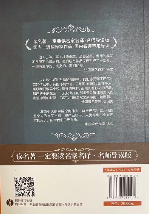 巴尔扎克著,傅雷译的《欧也妮·葛朗台/语文推荐阅读丛书》叙述了一个金钱毁灭人性和造成家庭悲剧的故事,围绕欧也妮的爱情悲剧这一中心事件,以葛朗台家庭内专制所掀起的阵阵波澜、家庭外银行家和公证人两户之间的明争暗斗和欧也妮对查理·葛朗台倾心相爱而查理背信弃义的痛苦的人世遭遇三条相互交织的情节线索连串小说。这是一幅法国19世纪前半期外省的色彩缤纷的社会风俗画,揭露了资本主义社会的罪恶、金钱对人的思想灵魂腐蚀和摧残。
