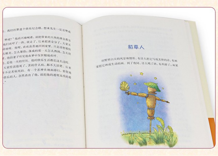 有一个老妇人,这个妇人非常可怜。她的田里有个稻草人,稻草人为她看守稻田。可是,蛾子在叶子上面下了子。老妇人没看到叶子卷起来了。肉虫把稻子全吃了,稻草人给老妇人警告,可老妇人不知道,稻草人看到渔妇和鲫鱼很可怜,自己又不能帮他们,就伤心的倒下了。《稻草人》这篇童话就通过一个富有同情心而又无能为力的稻草人的所见所思,真实地描写了二十 年代中国农村风雨飘摇的人间百态。