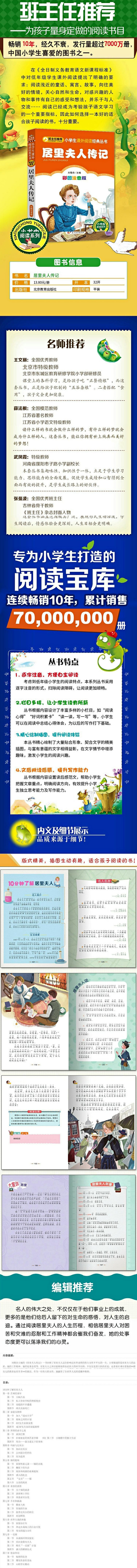 《居里夫人传记》一书回顾了居里夫人这位影响过世界进程的伟大女性不平凡的一生,主要描述的是居里夫人的品质、她的工作精神、她的处事态度等。居里夫人之所以能够取得如此伟大的科学功绩,不仅仅是靠大胆的直觉,也靠着在难以想象的极端困难的情况下对工作的热忱和顽强。她的品德力量和热忱值得每一个人敬重。此外她还用自己一生为人处世的崇高行为给女儿树立榜样,对女儿的教育也有许多独特的做法。作为一位伟大的女性,她赢得了全世界人民的爱戴和敬仰。