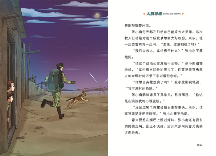 《大漠寻城》讲述的是特种兵少校张远带领孩子们深入沙漠探寻传说中的古城的故事。传说中的古城地处荒漠深处,充满神秘,令人向往。更为特别的是,一旦遭遇狂风大作的天气,四周便充斥着可怕的笑声或啼哭声。这究竟是怎么回事呢?父子三人进入古城,开始犹如穿越般的神奇探秘之旅。他们与各种可怕的“鬼怪”作斗争,最终用科学的方法揭开了一个个谜团。在这个故事里,特种兵少校将教会孩子们在沙漠中如何寻找水源、食物,如何辨别方向,如何夜行晓宿,如何发出求救信号等野外生存技能。