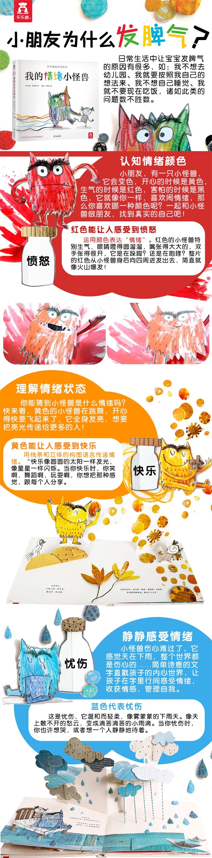 情绪是什么?看不见摸不着吗?不,情绪是一只有各种颜色的小怪兽。它快乐时想笑,忧伤时想哭,生气时像一只燃烧的小火球……书中精心设计的立体场景和线条,简洁、质朴的拼贴和童稚般的笔触,准确的绘本语言,吸引孩子阅读,教孩子轻松认知和控制情绪。