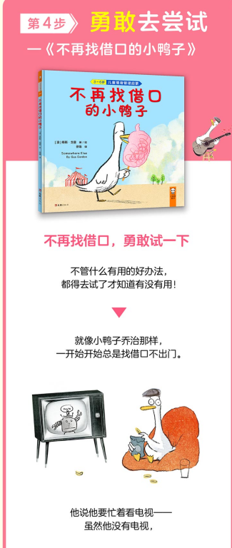 直到有一天,他的好朋友熊先生发现,其实所有事情都是借口,小鸭子只是不敢告诉大家自己不会飞。在勇敢地承认了害怕的事情后,小鸭子在熊先生的帮助下,终于解决了不会飞的问题,不再找借口的小鸭子也体会到了尝试新事物的美妙。