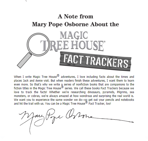 Filled with up-to-date information, photos, illustrations, and fun tidbits from Jack and Annie, the Magic Tree House Fact Trackers are the perfect way for kids to find out more about the topics they discovered in their favorite Magic Tree House adventures. And teachers can use Fact Trackers alongside their Magic Tree House fiction companions to meet common core text pairing needs.