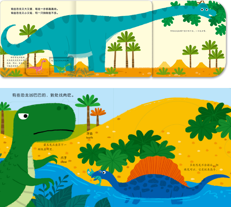 恐龙虽然已经消失,却一直是全世界关注的焦点,更是幼儿*为感兴趣的事物之一。本书通过简单生动的语言、色彩明亮的画面、丰富有趣的知识条,以及翻翻、转转、推拉、滑动等多种工艺,将恐龙的主要种类、特点、习性等形象地展示给小读者。宝宝可以边玩边读、边玩边学,促进手眼协调、手脑并用,提高好奇心、探索欲,更好地培养热爱生活、热爱科学的情操。