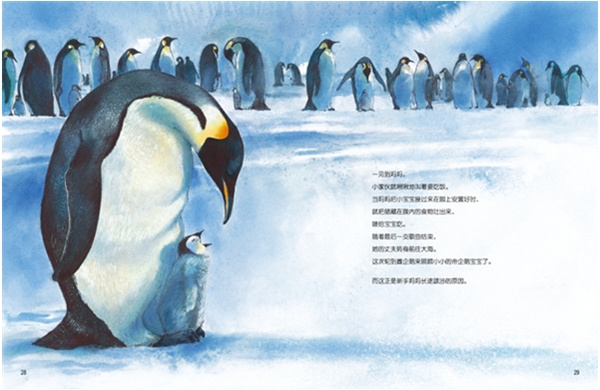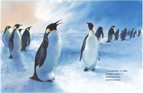 在马克尔简单的描述中,为了哺育后代,雌性帝企鹅离开她新孵蛋的地方后,就加入了一群雌性帝企鹅为期数周的冰川觅食旅程。本书文字简洁而富有诗意,并依据马克尔在南极的第一手观察而绘画而成:“日复一日——五天里 /年轻的妈妈/和其他伙伴们苦战着/穿越海冰,/然后,最后,他们到达浮冰,/牛奶色的浮冰与/蓝黑色的海水交融一起。”美丽的水彩场景跃然纸上,跟随着企鹅一起出发。它们面临着*的两个敌人——肆虐的暴风雪和饥饿的海豹——阐释了这次旅程的艰险。最终他们达到了浮冰,胃里装满了磷虾和鱼儿,回到了他们的巢穴,为新生的幼仔带来了丰富的食物。在儿童图书里,经常会描述帝企鹅的生命周期,但是这次读起来却是如此的新鲜和吸引人。这本书包含了作者的笔记、儿童阅读书单和网站列表。