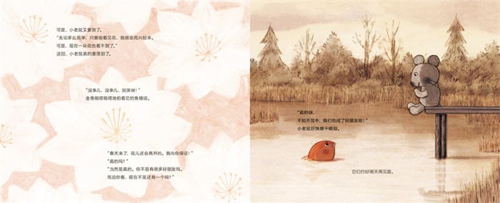 故事真的很温暖治愈,结局也很温馨。故事的后,爱瞎想、爱哭的小老鼠还是哭了,不过是高兴得哭了。值得一读。——日本亚马逊读者 初是被这本书的封面吸引,没想到故事也很暖心,讲述了心思敏感的小老鼠和金鱼的友情,不禁让人感叹友情真是个奇妙的东西。值得推荐。——日本亚马逊读者 书中小老鼠和金鱼的友情让人感动,并且还讲到了冬天来临时身边一些小动物的生活习性,比如说小燕子是候鸟,睡鼠要冬眠。同时也能教给孩子友情中出现矛盾时,要先了解对方的这个行为是不是有特定原因,以免产生误解。除此之外,插画中的金鱼白雪,一红一白的颜色对比,也很亮眼;每一页插画都好漂亮,冬天的风景刻画得很棒。——日本亚马逊读者 结局让人出乎意料,故事本身也很棒,是值得细细品读的一本图画书。因为孤单而爱哭的小老鼠,误以为朋友都不愿意理它了,原来这一切都是有原因的。故事的后,小老鼠还收获了一个好朋友——金鱼。让人不禁感叹友情的美好之处,这也是这本书打动人心的地方。推荐!——日本《绘本指南》读者 整本书运用了秋冬季节的灰白色调,使得红色的金鱼更加亮眼,氛围感十足。 刚开始,故事中的小老鼠和金鱼各自背负着没有朋友的孤独感,结果却发现一切都是自己误会了。在小老鼠吐露不能见到各种朋友的寂寞时,家里的孩子也许是想到了这是个离别的季节,也产生了共鸣。好在故事的结局还是很温馨的,也给了孩子些许安慰。总之,这是个非常适合在冬天里讲给孩子听的故事。——日本《绘本指南》读者 插画也太棒了,故事特别打动人心。故事的刚开始,我还一直在想“什么花是冬天会开的呢”,看到结局真的太意外了,原来是开在冬日里的“友谊之花”,让人不禁感叹它的美丽。一个非常温馨治愈的故事。——日本《绘本指南》读者 插画的色彩虽然不是很丰富,但是极具秋冬氛围感。故事的后,冰面下大大的红色的花是真的好看。除此之外,小老鼠和金鱼的一问一答也好可爱。是一本很不错的图画书。——日本《绘本指南》读者 “盛开的冬日之花”,光看题目就给人一种温暖的感觉。一边好奇冬天里开的是什么花呢,一边开始读书中的故事。读完后发现原来这是个关于友情的故事,很温暖治愈。插画和故事都不错,冬天里把这个故事讲给孩子听,一定会很温暖。——日本《绘本指南》读者 真是一个触动人心的温暖故事。人有时总会有一种莫名的孤独感。就像故事中的小老鼠一样,即使有很多好朋友,但只要朋友们不在眼前,还是会担心,会觉得孤独。但每段关系、每份感情也确实是这样,越是看不到,就越会瞎想。真的是一本很不错的图画书,除了故事温暖之外,插画的色调也特别美。——日本《绘本指南》读者 相互谅解、友情、相遇、离别、感动等这些思绪,和冬天里的风景都在这本图画书中完美展现。读完这个故事,我觉得自己大概也是故事中的小老鼠,容易瞎想,容易产生误解,到头来却发现爱自己的人一直都在身边,但明白这一点真的很需要勇气。故事和插图也都很不错,温暖治愈,值得推荐。——日本《绘本指南》读者