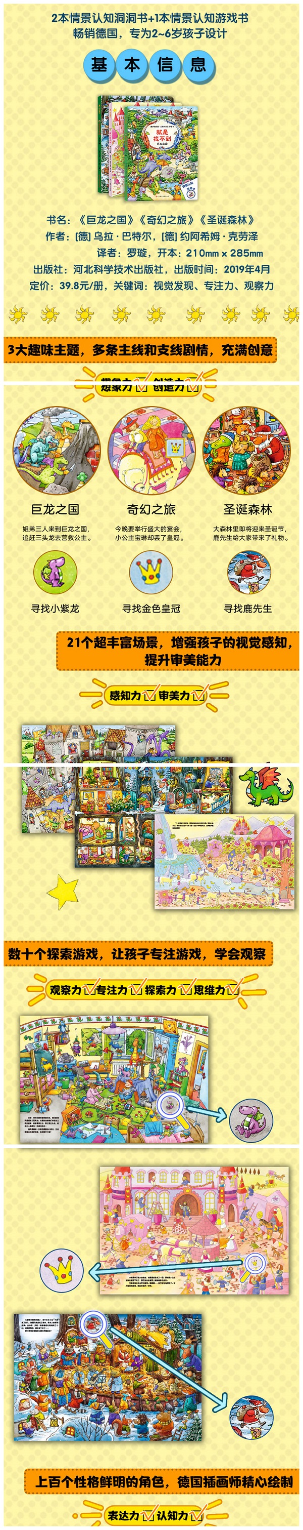 这是一本充满趣味的游戏绘本,每一页上都带有洞洞设设计,小朋友在有趣的寻找游戏中进行词汇认知、图画观察、故事表述。这本书有很强的参与感和体验感,适合2~6岁的孩子,是一本将游戏与故事完美结合的游戏书,能够增强孩子的想象力,提高他们的综合素养,具有很好的社会效益。