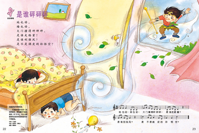 为了兼顾各年龄层,文字有大小、深浅之分,图画也有大小的差别;但是彼此间会有自然的连贯。幼儿是从图像中学习到文字的具体意义,而并非借由抽象的汉语拼音字母。因此,我们有意未强调汉语拼音和认字,而是在潜移默化中影响孩子,引导孩子学习。