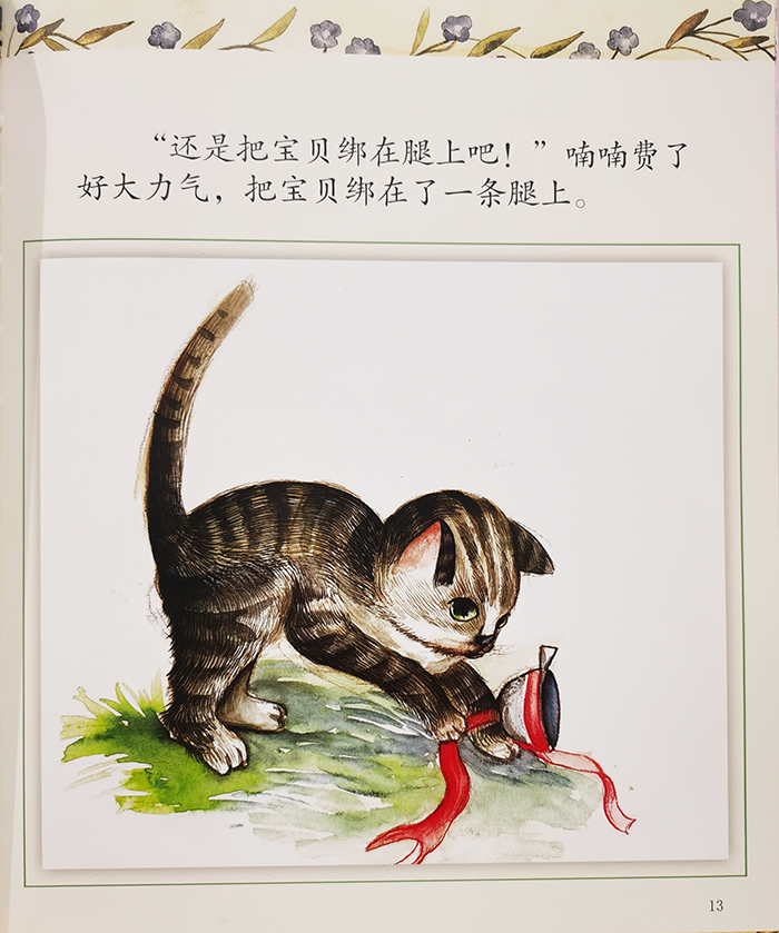 这是一个有趣的故事。小猫不认识车铃,试着戴在头上、挂在脖子上、绑在尾巴上和绑在腿上,但都很不舒服。后来,猴大哥将车铃按在自行车的车把上,一下就让小猫明白了“车铃应该放在自行车上”,世界上不同的东西,各有自己合适的位置和作用。在读故事的过程中,可以学习不同的动词“戴”、“挂”、“绑”,认识小猫身体的不同部位“头”、“脖子”、“尾巴”、“腿”,还可以一起来表演这个故事。