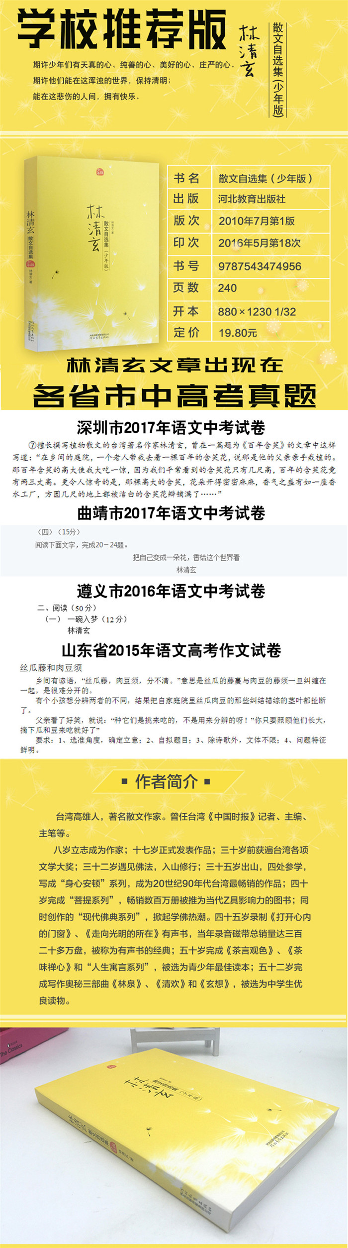 重点推荐青少年阅读林清玄作品理由: ★林清玄文章是中考,高考“常客“,各省市中高考真题多次出现林清玄文章。 ★本书是千万量级畅销书作家林清玄写给天下孩子的作品! ★古龙三毛传奇好友;星云法师、南怀瑾、于丹推崇的心灵大师! ★《人民日报》推荐***作家!