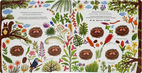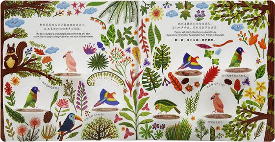 本书以丛林为背景,用拟人化的方式给孩子介绍了丛林中生活的一些动物,鹦鹉、松鼠、啄木鸟、刺猬等,孩子能轻轻松松理解这些动物的主要特点。全书绘画风格独特,采用零碎的动植物、事物展现了每页中的“主角”主要活动的环境,画风清新、色彩亮丽;另外,翻翻以及视觉记忆游戏的巧妙结合,有趣的找寻游戏,更是对孩子眼力的大考验,能锻炼孩子的记忆力,培养专注力、观察力;巧妙加入的数量变化还能对孩子进行数学启蒙。