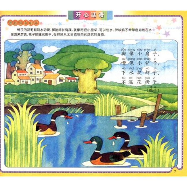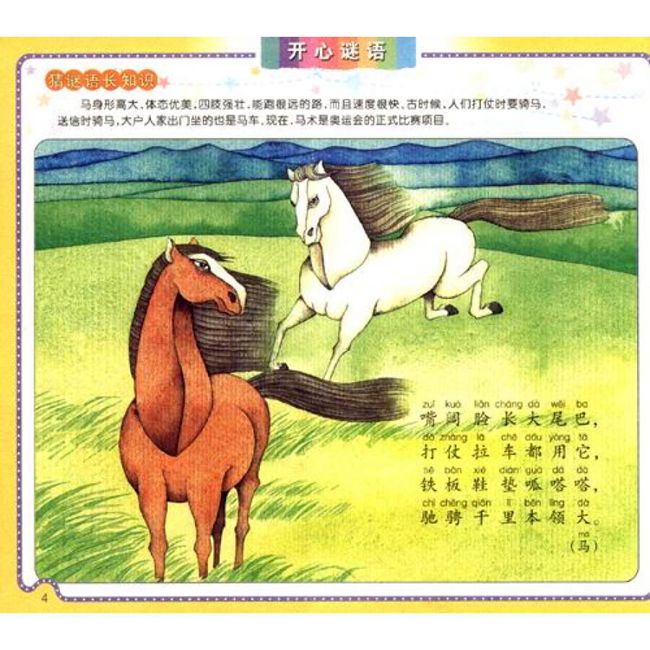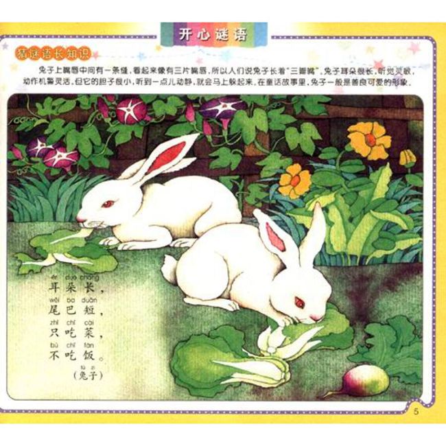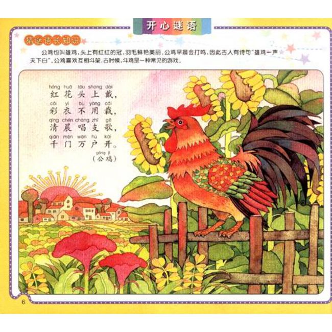 《开心谜语》选编了孩子们喜闻乐见的谜语两百余则,并配以相应的彩图作为谜底,耐猜、耐想,符合孩子的欣赏趣味和智力发展水平。为了丰富《开心谜语》的知识含量,每则谜语还设有“猜谜语长知识”环节,对所猜之物进行相关介绍,带领孩子发现自然的奥秘,探索世界的神奇。