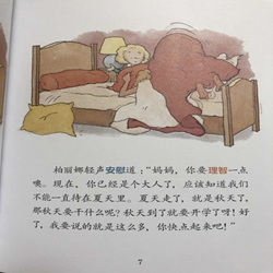 今天是开学的日子。一大早,柏丽娜就从睡梦中醒了过来。她自己穿好衣服,便去叫妈妈起床:“妈妈。快醒醒!我们该出发去学校了,不然就要迟到了!”妈妈的好梦被打断了,心情很烦躁。她把头埋进枕头里,嘴里嘟囔着:“不要,不要,不要!我不想起床!怎么就开学了呢,我还没玩够呢!我还想和你一块去散步,一起学游泳,就是不想去学校。”