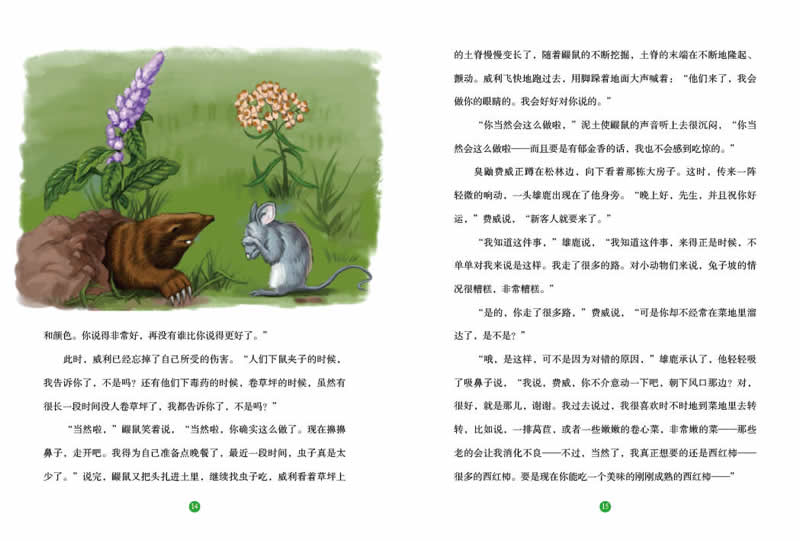 “我不知道,”伯奇嘟囔着,“我想我的健康状态还行,不过我刚从洞里爬出来,身体太瘦了,可是真该死,光吃这些东西,怎么才能让一个小伙子的肋骨上长点肉呢?”说完他对着这片长满荒草的地——一小块一小块的草坪——厌恶地挥了挥爪子。“上次住的那些人真是邋遢鬼,就是这样,一帮邋遢鬼。什么事也不做,什么东西也不种,什么都不管,让一切都完蛋了。谢天谢地,这帮家伙终于走了,咱们终于解脱了,我要说的是,有新客人来了,他们来得正是时候。”
